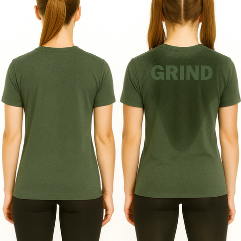 Built for athletes who refuse shortcuts, the GRIND Sweat-Activated Tee turns your effort into a visual display of commitment. As training intensity rises, a hidden GRIND design emerges across the back—revealed only through sweat—reminding you that greatness is earned rep by rep, session by session.